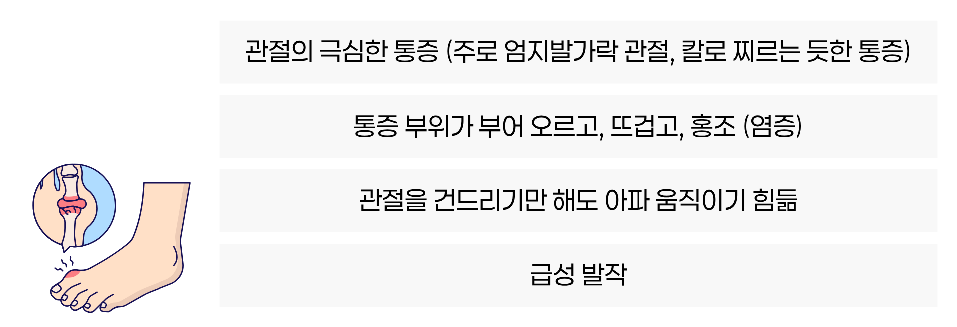 | 통풍? | 통풍은 혈액 내에 요산의 농도가 높아지면서 발생한 요산염 결정이 관절의 연골, 힘줄, 주위 조직에 쌓여 염증을 유발하는 질병입니다. 통풍은 임상 증상과과 혈액 검사, 영상 검사등을 종합하여 진단합니다. |