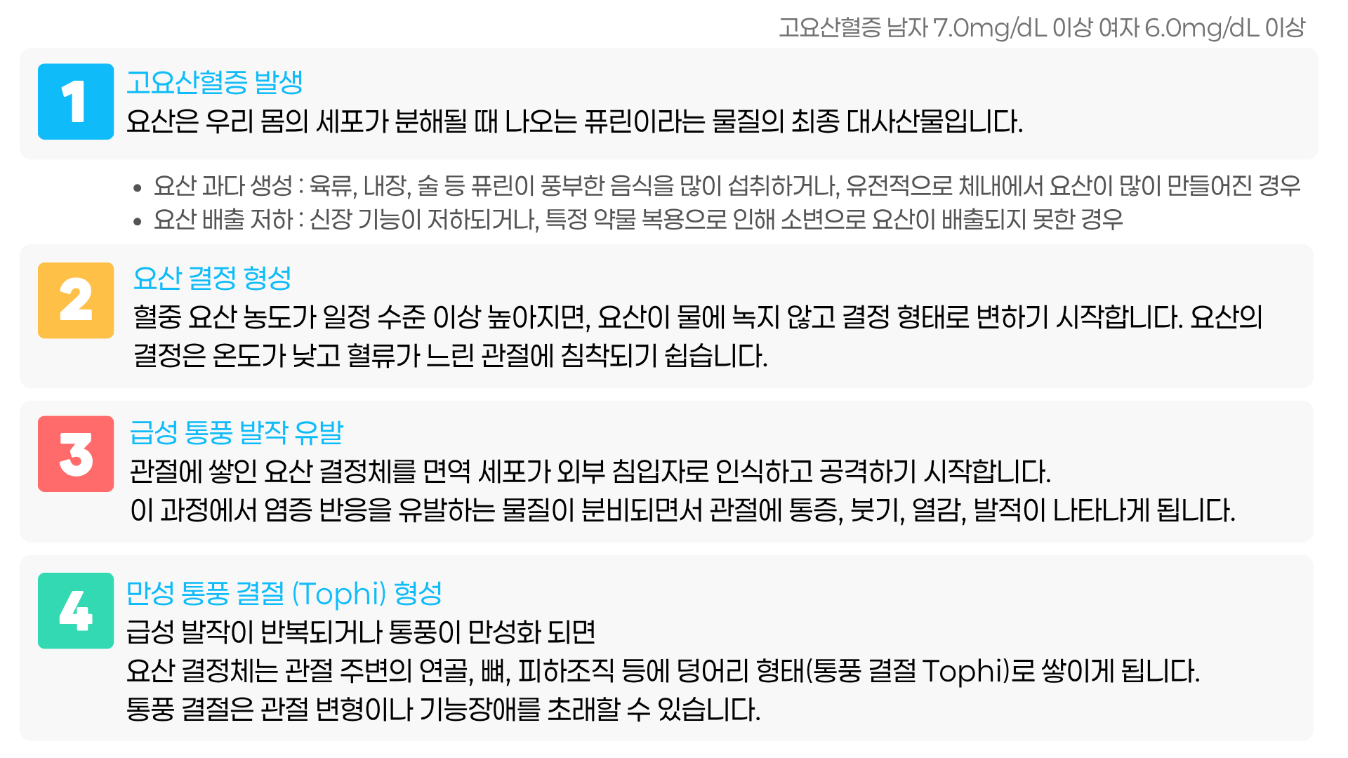 통풍은 꾸준히 치료하지 않으면 통증이 없는 간헐기를 지나 만성 결절성 통풍으로 진행합니다.