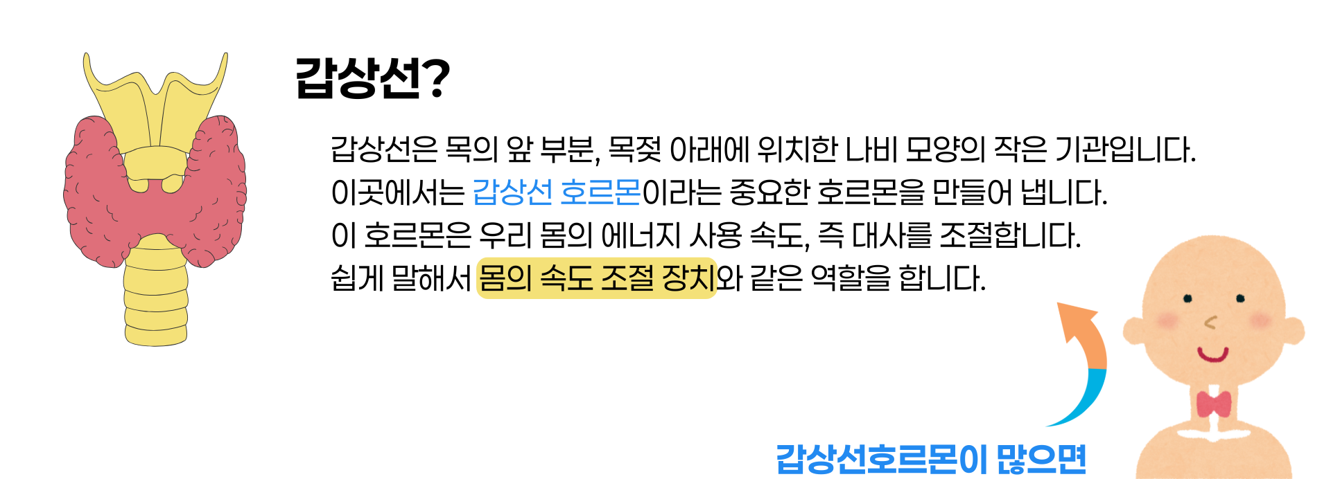 갑상선 호르몬은 우리 몸의 에너지대사에 관여하여 체온을 유지하고 신진대사를 조절합니다. 갑상선 기능항진증은 갑상선에서 갑상선 호르몬이 과잉 생산되어 혈액 내 증가하여 갑상선의 생리적 작용이 과도하게 나타나는 임상증후군입니다. |