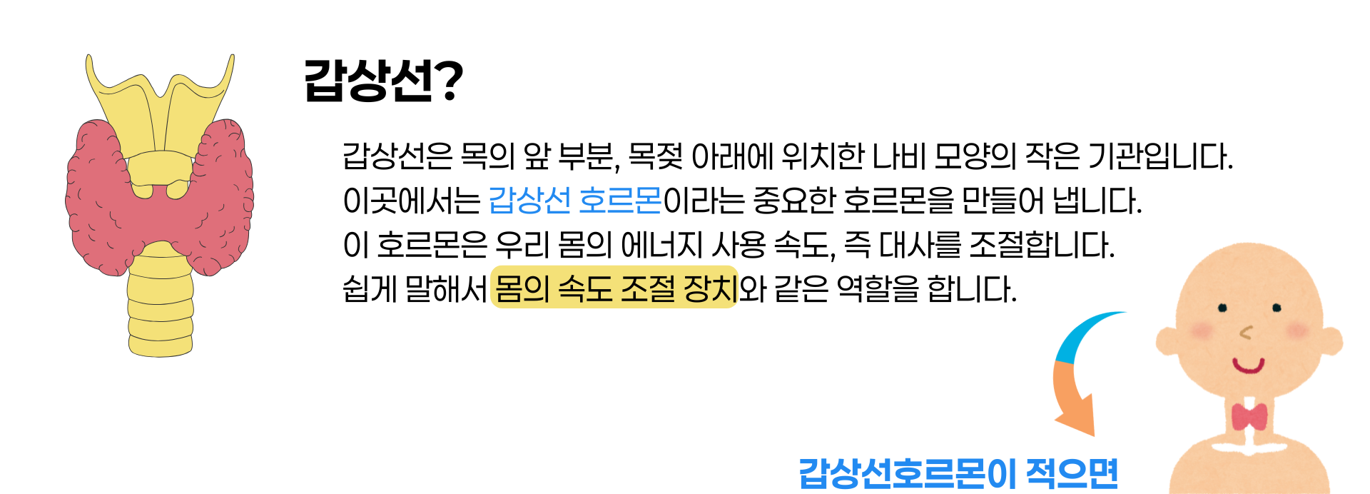 갑상선 호르몬은 우리 몸의 에너지대사에 관여하여 체온을 유지하고 신진대사를 조절합니다. 갑상선 기능저하증은 갑상선에서 갑상선 호르몬이 충분히 생성되지 않아 기초대사량이 떨어져 몸의 모든 기능이 저하되는 임상증후군입니다. |