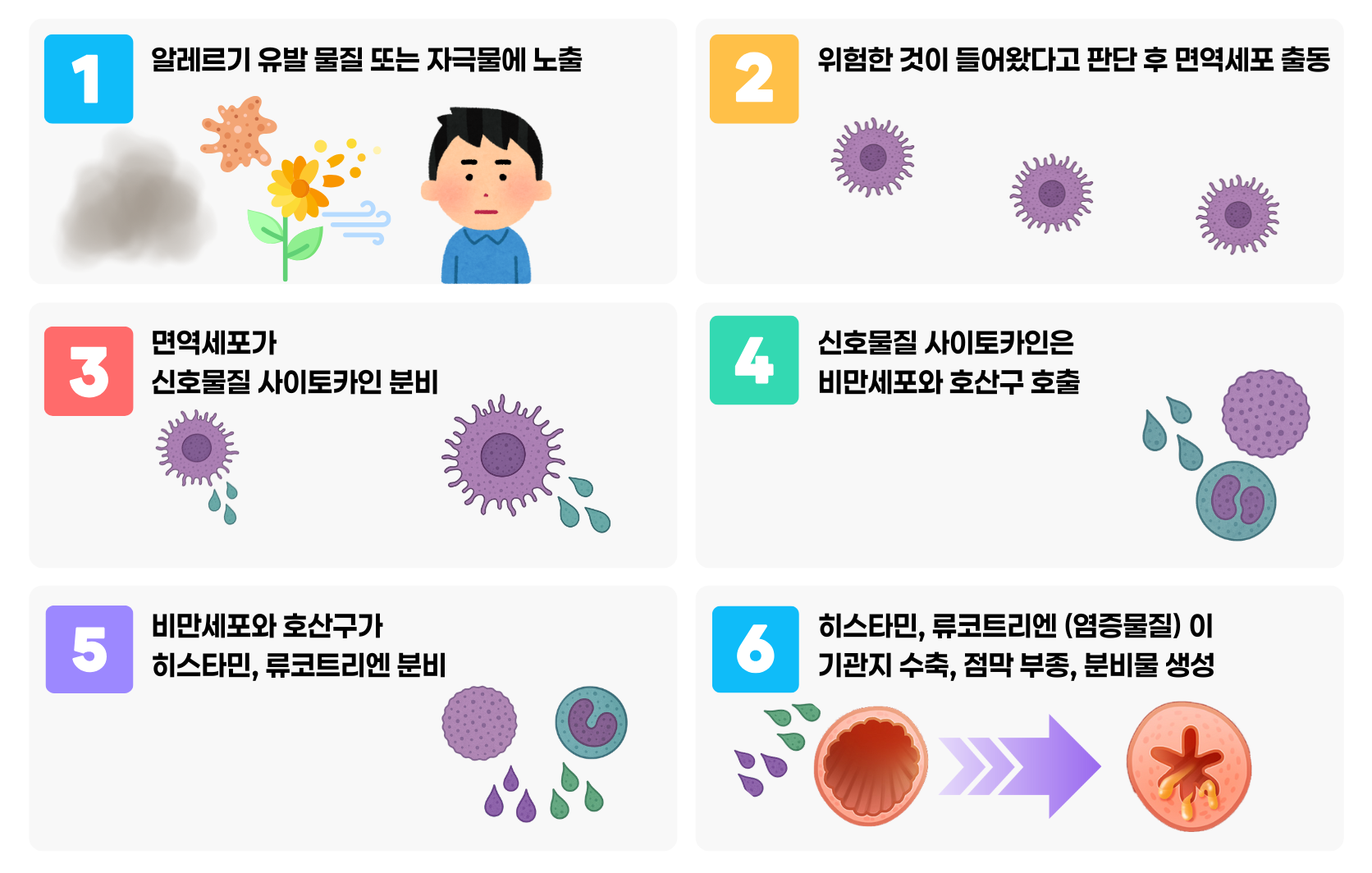 천명(쌕쌕거림) 숨을 들이쉬거나 내쉴 때 휘파람처럼 ‘쌕쌕’ 소리가 납니다. 기침 한 번 시작하면 멈추기 어렵고, 밤에 심해지는 경향이 있습니다. 흉부 압박감 기도가 좁아져 공기 흐름이 원활하지 않기 때문에 가슴이 조여오거나 답답하게 느껴집니다. 호흡 곤란 숨 쉬기가 힘들고, 마치 빨대를 물고 호흡하는 듯한 답답함을 느낄 수 있습니다. 가래 염증으로 인해 분비물이 늘어나면서 기관지를 막고, 기침이나 호흡 곤란을 유발할 수 있습니다. |