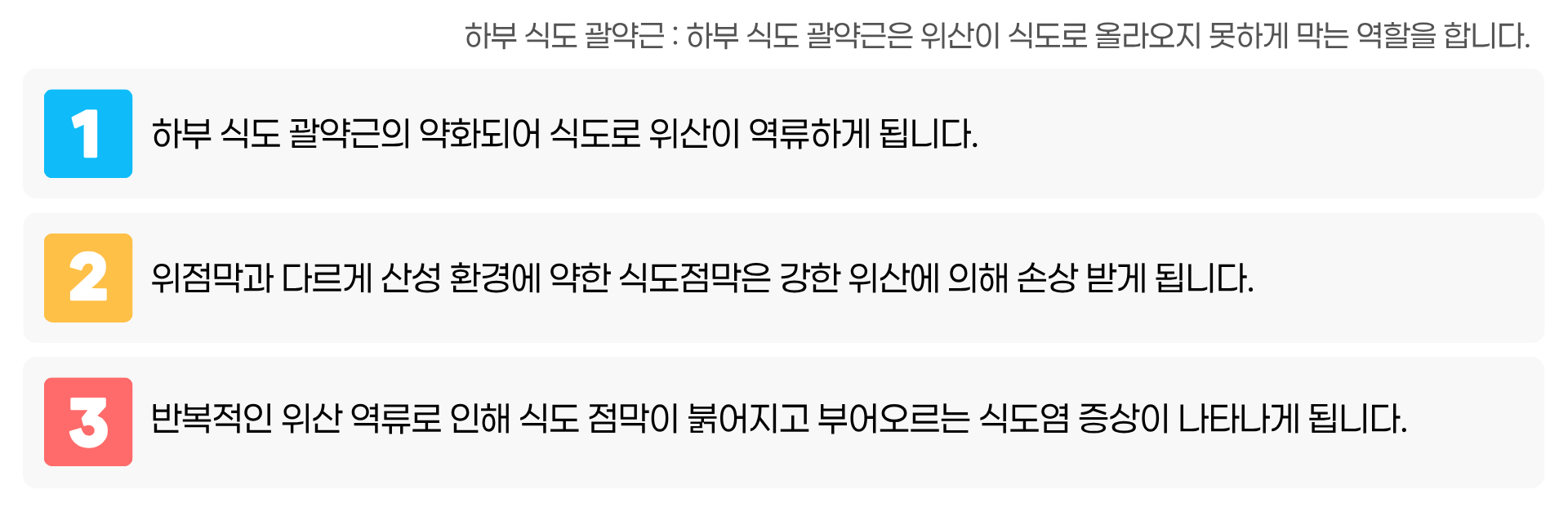 위산이 식도를 반복적으로 자극하면 식도궤양이나 협착, 만성 염증으로 진행될 수 있습니다.