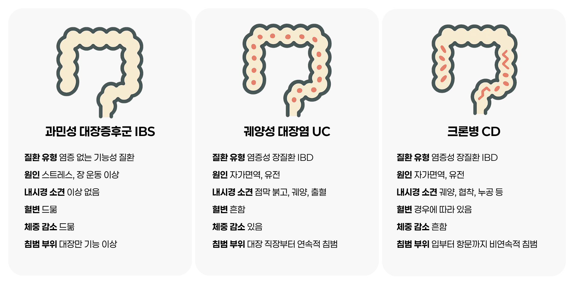 과민성 대장증후군은 기능성 질환으로, 궤양성 대장염이나 크론병과 초기 증상이 유사할 수 있습니다. 하지만 궤양성 대장염과 크론병은 절대 방치해서는 안 되는 염증성 장질환으로, 치료하지 않고 방치할 경우 심각한 합병증으로 이어질 수 있습니다. 따라서 이러한 질환들과의 감별을 위해 대장내시경 검사가 필요합니다. |