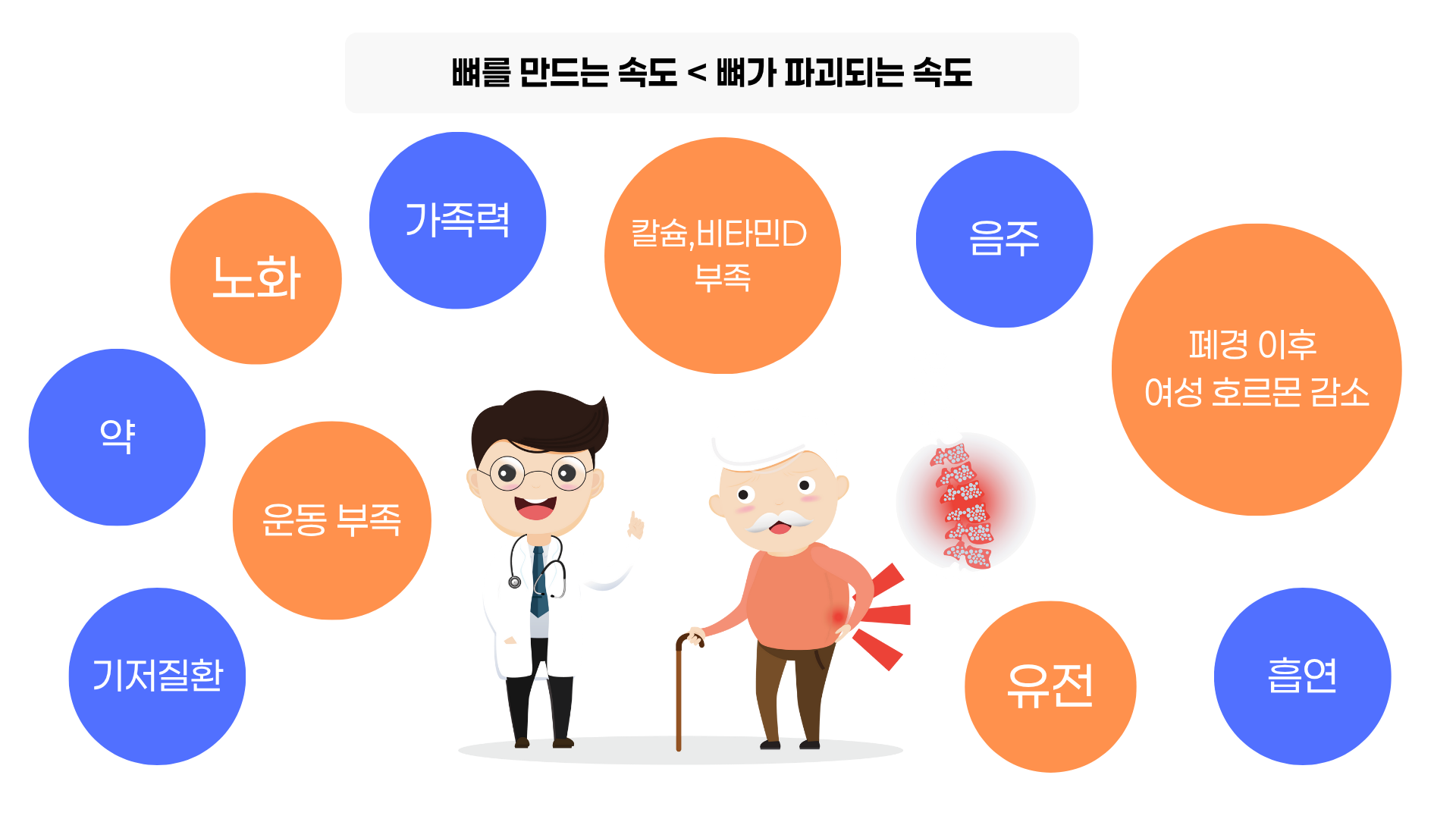 골다공증은 뼈의 밀도와 강도가 감소하여 쉽게 골절이 일어나는 만성질환입니다. 처음에는 특별한 증상이 없지만, 뼈의 강도가 점점 약해지면서 작은 충격이나 일상적인 움직임에도 골절이 생길 수 있습니다. 시간이 지나면서 척추, 엉덩이, 손목 등 주요 부위에 골절 위험이 높아지고, 일상 생활에 큰 제약을 줄 수 있어 조기 발견과 관리가 무엇보다 중요합니다. |